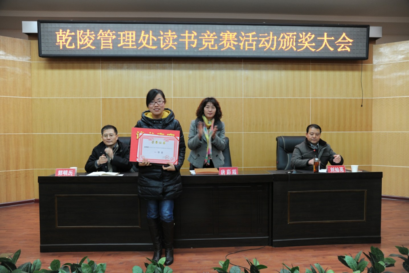 会议首先由管理处副主任丁伟同志宣读了《乾陵管理处关于读书竞赛活动获奖人员的表彰通报》;省旅游局规划处处长郭明历同志、县委常委、统战部部长唐彩霞同志、乾陵管理处党委书记刘灿亮同志,向获得荣誉的同志颁发了奖金和奖牌;随后,郭明历处长围绕全面“5A”景区建设基本情况、国家“5A”景