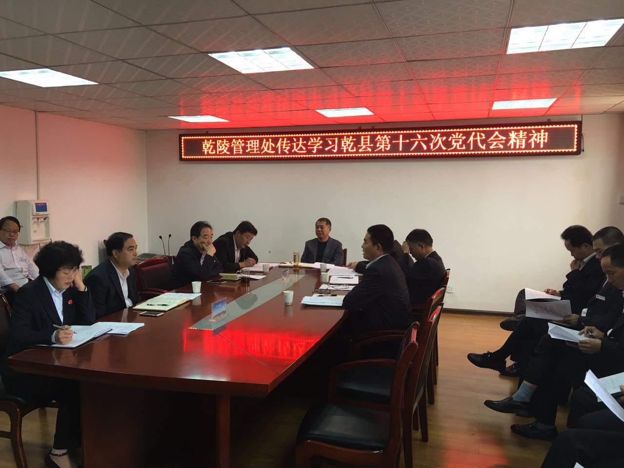 【概要描述】          9月30日,乾陵管理处组织全体领导及中层干部召开专题会议,及时传达学习了中共乾县第十六次代表大会精神。乾陵管理处主任杨宗战出席了会议并作重要讲话。         会上,乾陵管理处党委书记刘灿亮传达了党代会过去五年主要工作回顾、今后五年指导思想、奋斗目标和工作任务、从严提升党建工作水平等会议基本情况,传达了选举产生中共乾县第十六届委员会和纪律检查委员会、选举出席中共咸阳市第七次代表大会代表等情况。要求全体党员领导干部要统一思想,提高认识,准确把握,切实将会议精神落到实处。