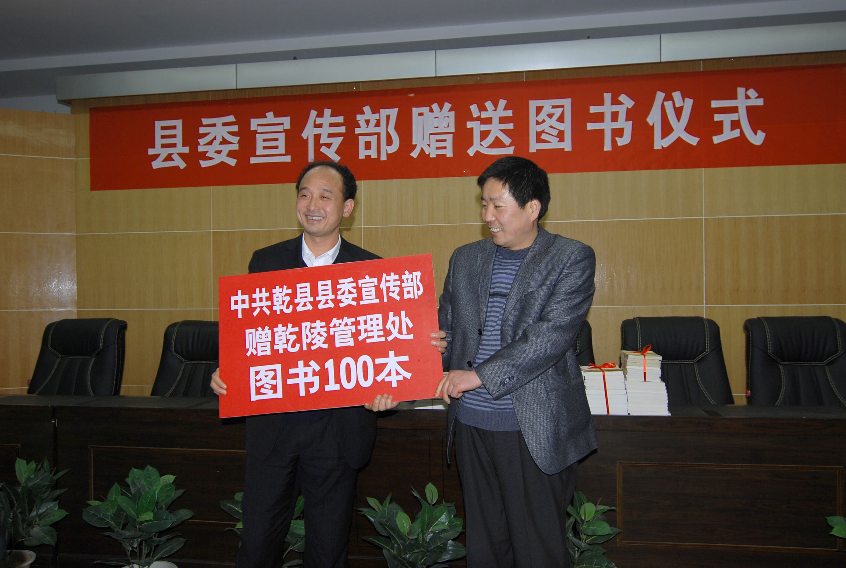 【概要描述】 为进一步提高广大干部职工思想道德素质和科学文化素质,提升景区服务水平,树立良好的旅游景区对外形象,更好地促进文物旅游事业大繁荣大发展。3月21日下午,中共乾县县委宣传部在乾陵管理处举行图书赠送仪式。乾陵管理处全体领导、中层干部及部分职工参加了赠送仪式。仪式由管理处党委副书记陈占地同志主持。 李乾宁副部长代表县委宣传部向管理处赠送图书并讲话,他说:县委、县政府高度重视文物旅游产业发展,大力实施“旅游突破”战略,这是加快县域经济跨越发展的一个重要途径。举办这次图书赠送活动,一是要让广大干部职工以读书活动为契机,解放思想,提高认识,本着阅读与思考相结合的方式,引领读书风尚,多读书、读好书;二是要学以致用。读书要有侧重点,要把学习与运用相结合,从学习中捕捉信息,用丰富的阅读提高整体素质,增强业务能力,树立对外形象;三是要把工作化与制度化相结合,通过读书,指导实践,持续推动乾陵文物旅游事业健康发展,真正把乾陵这一旅游品牌打响叫亮。 此次赠送图书共100册,内容涵盖政治、经济、历史、文化、科普、管理等方面。县委常委、乾陵管理处主任景雪峰代表管理处全体干部职工对县委宣传部举办的这次图书赠送活动表示感谢!并就如何读好书做了具体安排。