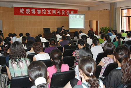 【概要描述】 为了提高乾陵景区广大干部职工的整体素质,进一步规范其服务行为,提升服务质量,根据乾陵博物馆年度教育培训计划和目前开展的"三讲"教育活动,8月14日,馆邀请陕西省旅游学校王西平老师为广大干部职工进行了文明礼仪知识讲座. 王老师结合旅游服务行业的性质和特点,从礼貌、礼节、仪容仪表、礼貌语言、服务态度、仪态等六方面进行了深入浅出通俗易懂的讲解。王老师或亲自示范指导、或现场提问,方法灵活、生动,引来了阵阵掌声。通过讲解培训,广大干部职工服务理念得到进一步增强,同时明确了改进方向,为今后提高乾旅游服务水平奠定了基础。