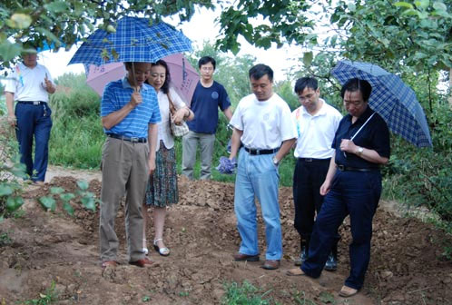 2008年7月17日,周处长、孔昱调研员与西安文保中心尹申平主任一行在乾陵博物馆樊英峰馆长陪同下,冒雨来到乾陵北门考察新发现的石仗马、牵马人及石刻基座,对北门新的发现表示祝贺。随后来到馆内检查了贵宾接待室的建设情况。结合新发现石刻周处长就乾陵内城北门石刻文物保护修复及保存环境治理提出新的保护要求,他明确指示:"乾陵石刻保护务必遵从少干预,保护原貌的原则,做到石刻扶正,基础加固"。针对新的情况,指示西安文保中心和乾陵博物馆拿出北门出新的保护方案,并作为"中日唐陵石刻保护"项目的一部分,但不能影响"中日唐陵石刻保护"项目的整体进程。做到"方法科学,专家认可,游客满意"。