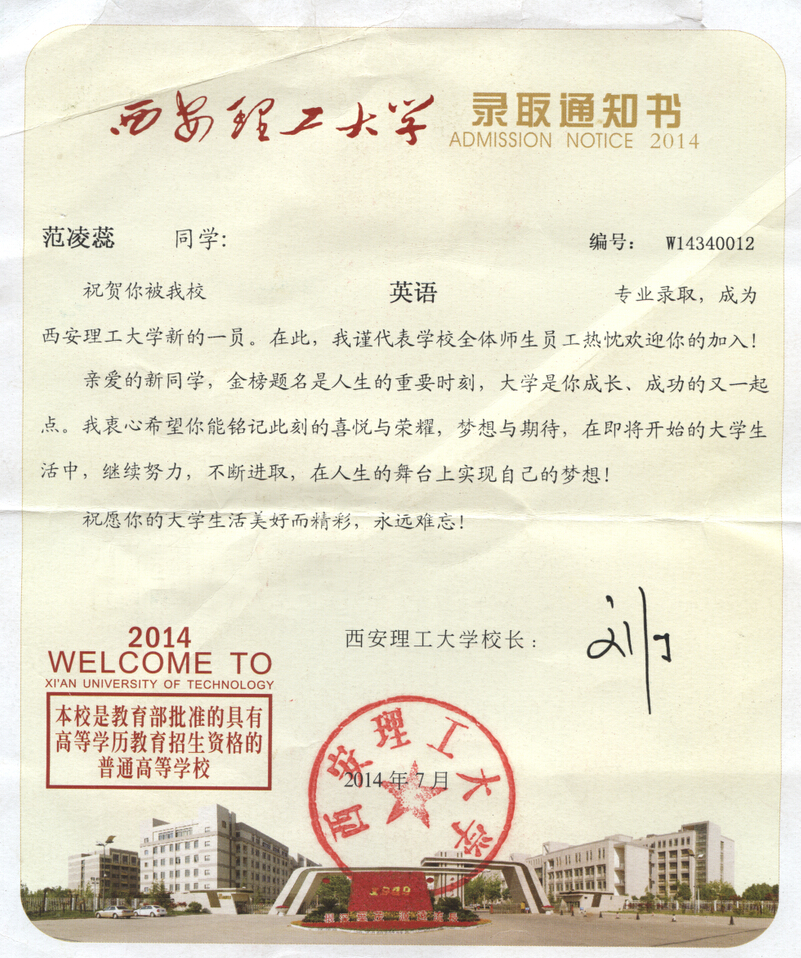 2014年8月18日上午,乾陵景区懿德太子墓博物馆工作人员捡到西安理工大学新生范凌蕊同学录取通知书,请范同学携带相关证件与乾陵管理处办公室联系。