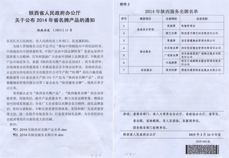 近日,陕西省人民政府办公厅陕政办发[2015]11号文件公布了2014年省名牌产品企业,乾陵管理处被认定为“陕西服务名牌”企业。