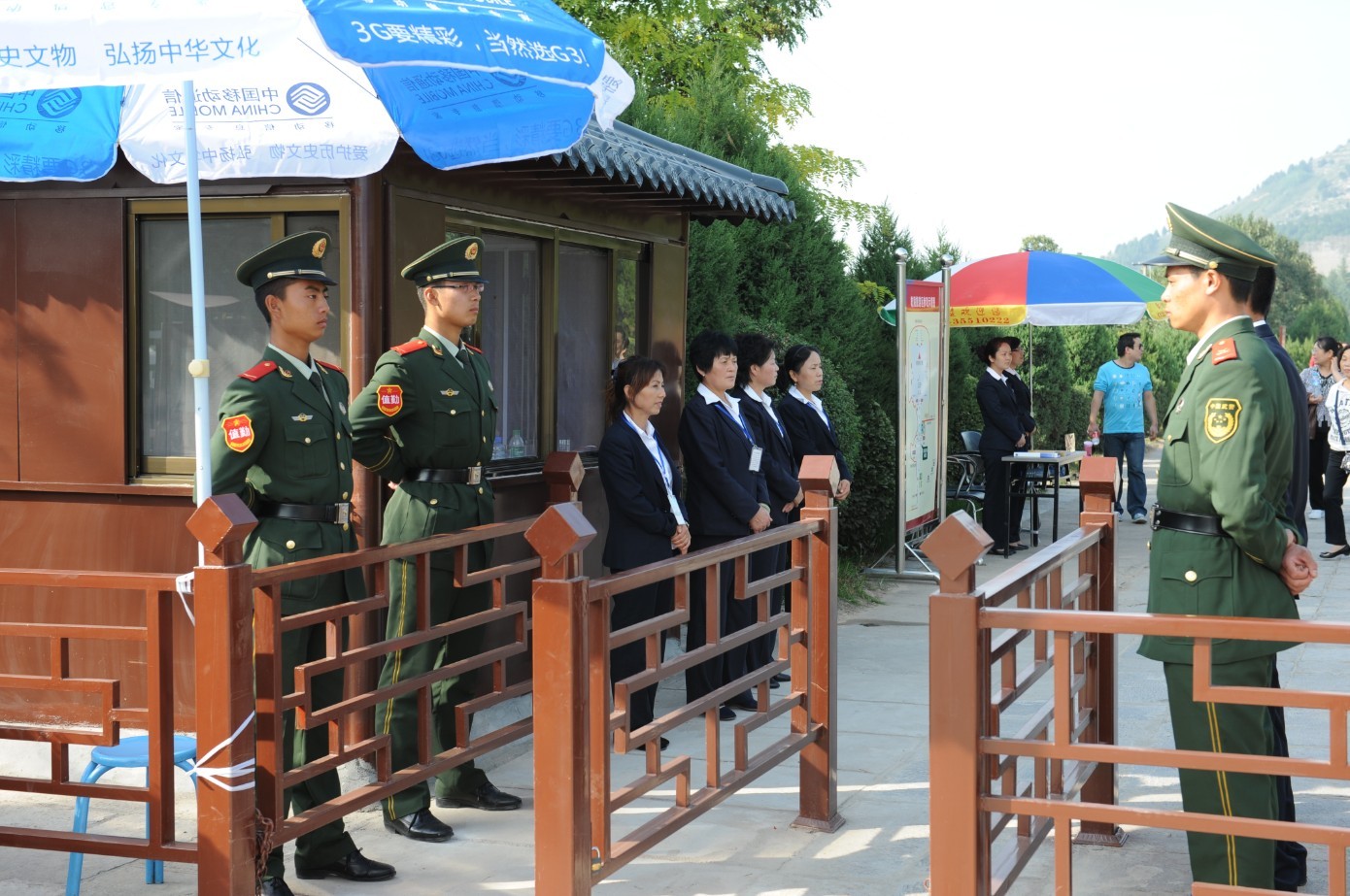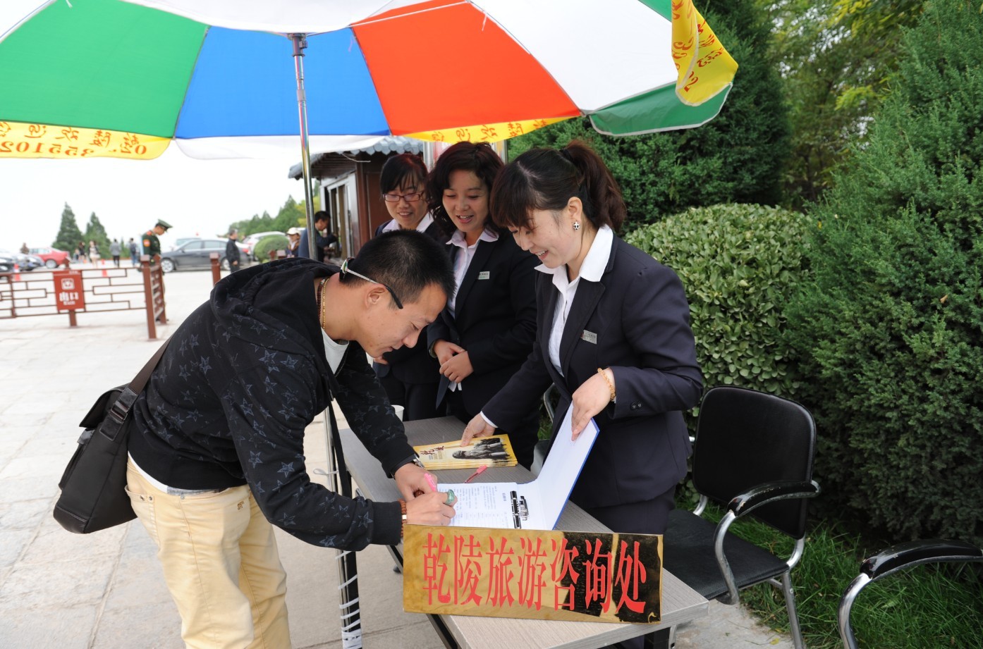 “十一”假日旅游第四天,乾陵景区接待人数持续上升,散客比重逐步扩大,自驾游明显增加,景区停车场停满了大大小小的车辆,随处可见家庭团队和肩背旅游包的散客团队。从迎着朝阳接待当天第一批游客开始,无论是大陵,还是博物馆,五个景点工作人员统一着装,佩戴胸牌,精神饱满。