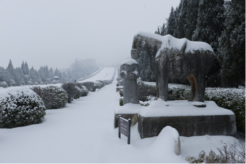 当冬天降雪,乾陵白雪皑皑,银装素裹。苍柏雪压枝头,翠盖笼烟,碧枝萦缟,满山遍野柏舞银雪的壮美奇观磅礴着无限生机。