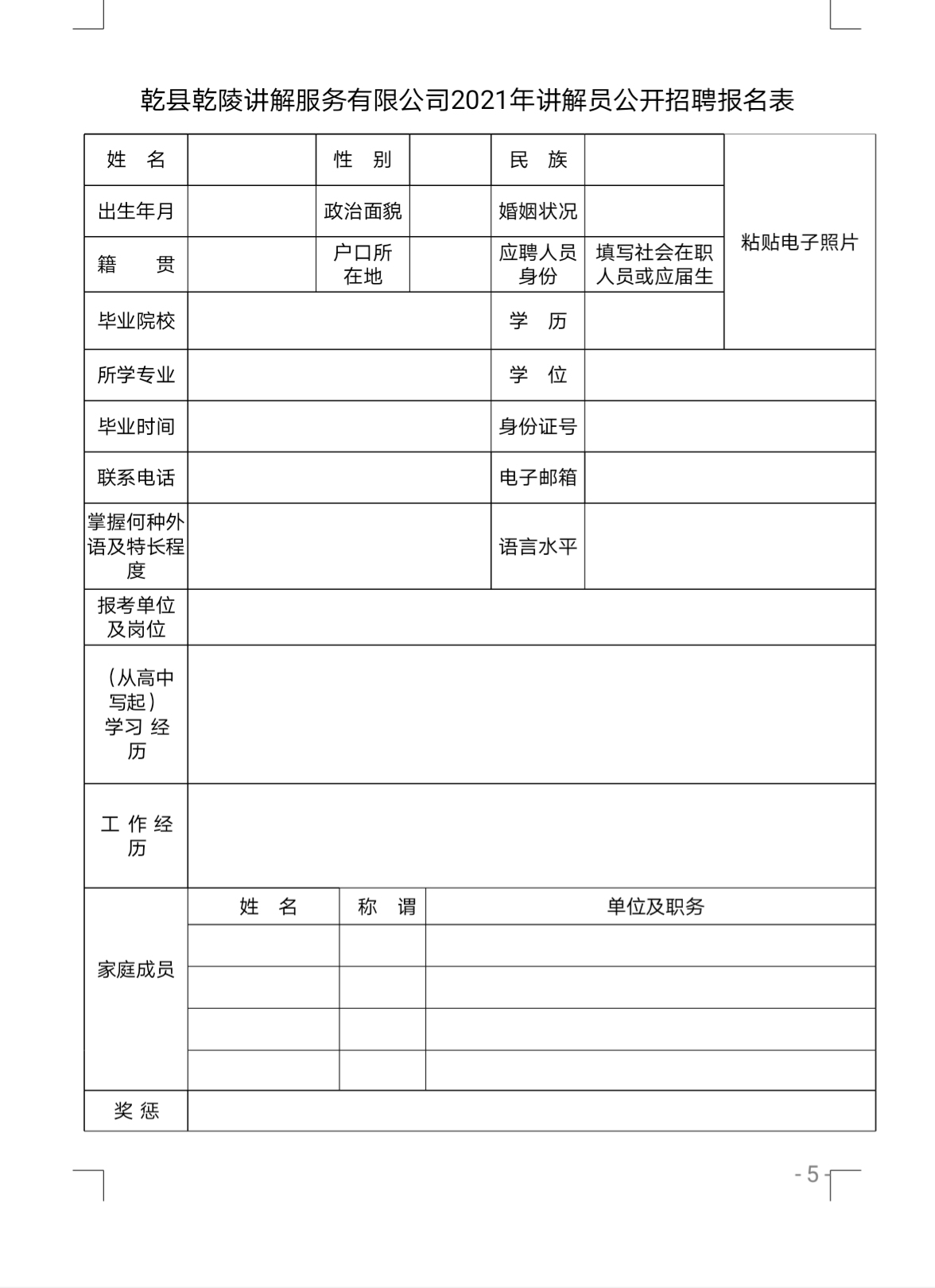 (一)报名时间从公告之日起至2021年3月31日截止。应聘人员认真填写《乾县乾陵讲解服务有限公司2021年讲解员公开招聘报名表》(附:学历证、普通话测试等级、外语等级证、身份证、户口本等证照电子版),在规定的报名时间内发送至报名邮箱。邮件标题、附件名称为“姓名+应聘单位”。